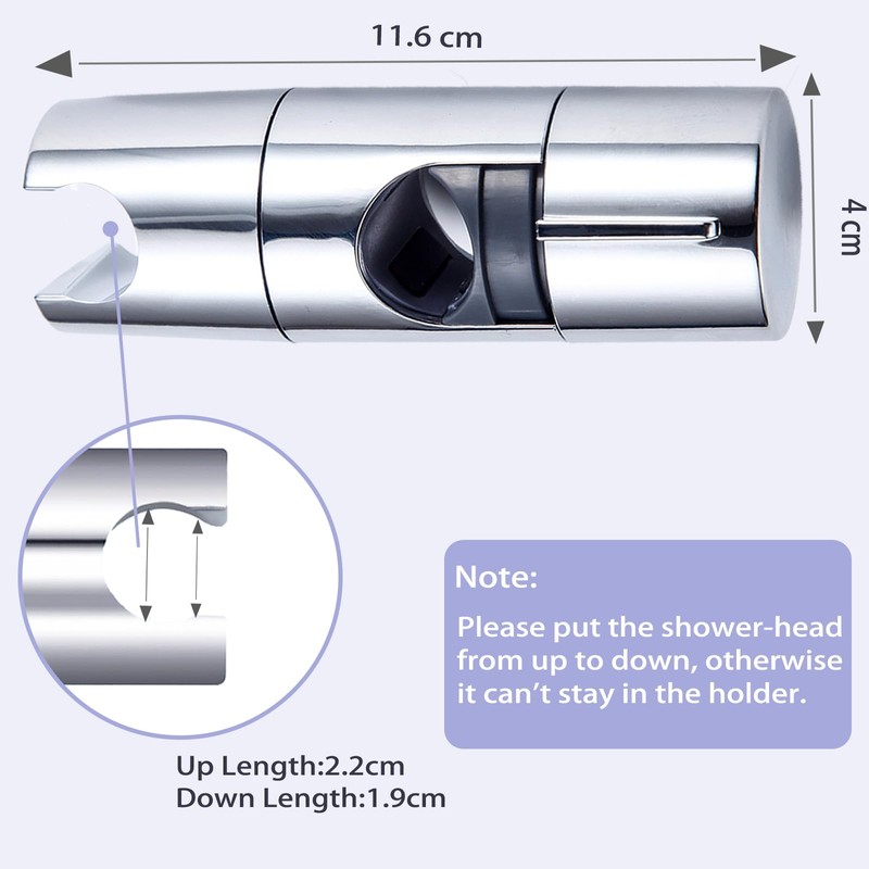 This adjustable shower head holder is designed for universal compatibility with most slide bars ranging from 18MM to 25MM thickness. Its 90-degree rotating mechanism allows you to set the perfect shower angle, while the anti-slip resin padding ensures stability and protects your shower rail surface. Crafted from upgraded ABS material with a chrome finish, it combines durability with a sleek appearance to withstand daily wear and moisture exposure.