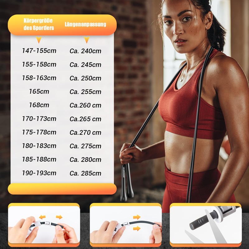 - Durable jump rope: the rope of our adult skipping rope is made of PVC and silicone material, strong and lightweight, not easy to knot, very smooth jumping. The five millimeter thick body of the rope has passed 1 million abrasion tests on 4 types of surfaces: wood, concrete, tiles and plastic blades. 3M rope length can be easily adjusted to the correct length without tools, perfect for the whole family.