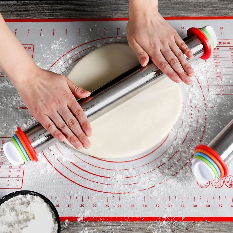 - Our Adjustable Stainless-Steel Rolling Pin is crafted from food-grade 304 stainless steel. The construction ensures the pin won’t dent for any food-crafting while no flavors, smells or colors will be absorbed. Performs better than silicone- or wood-based rolling pins.