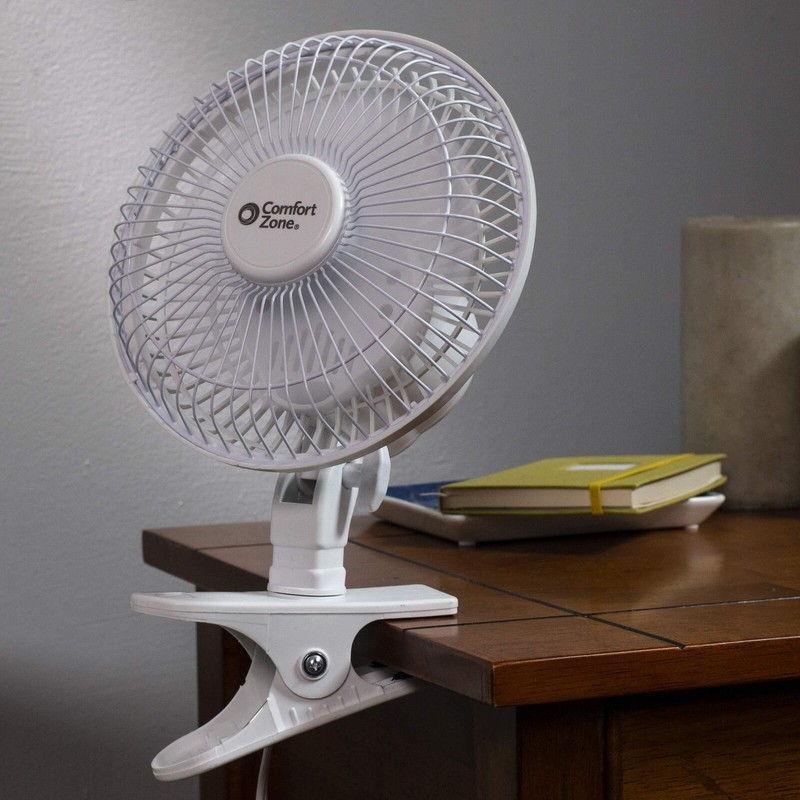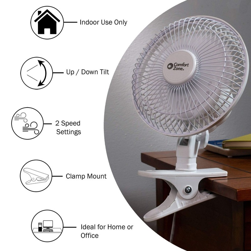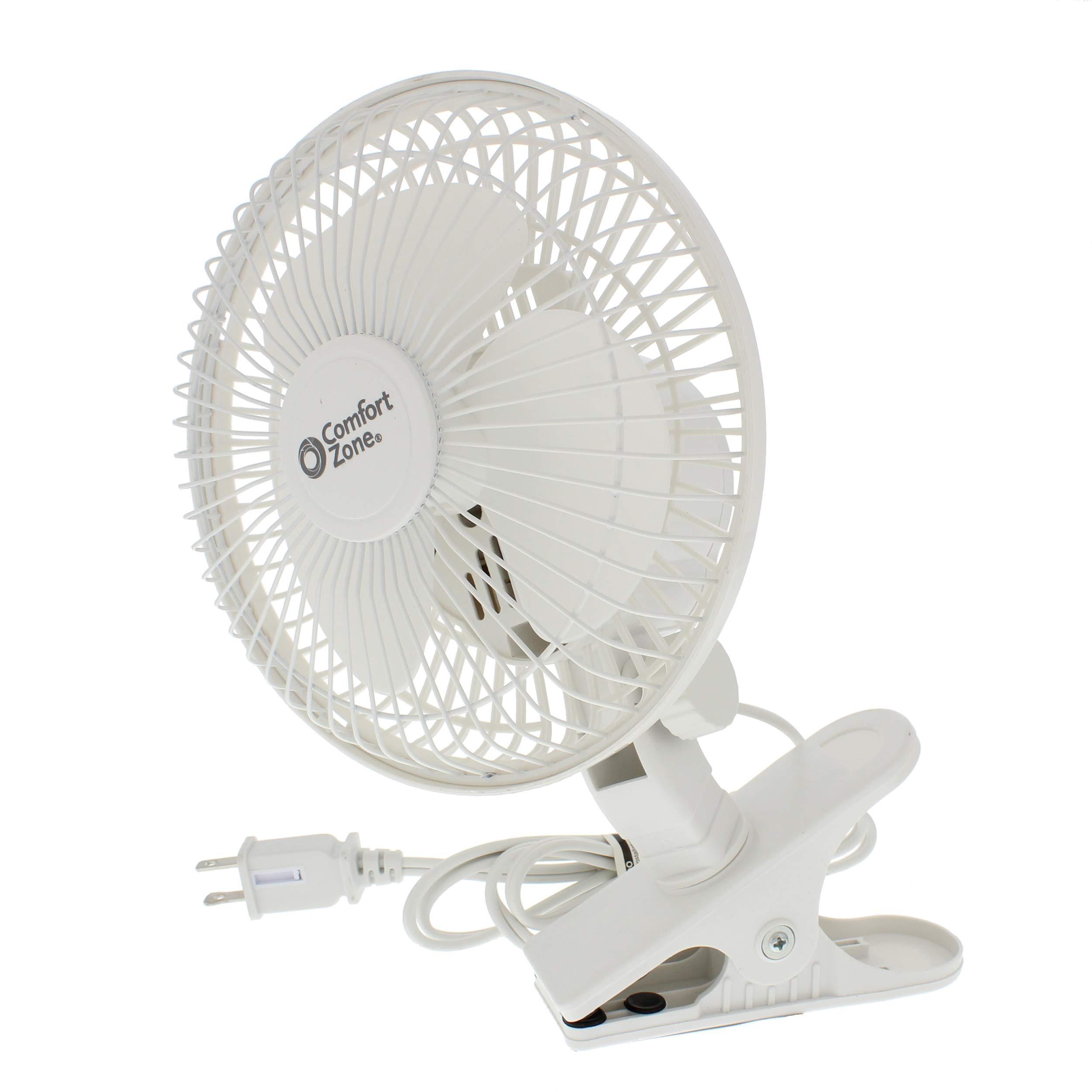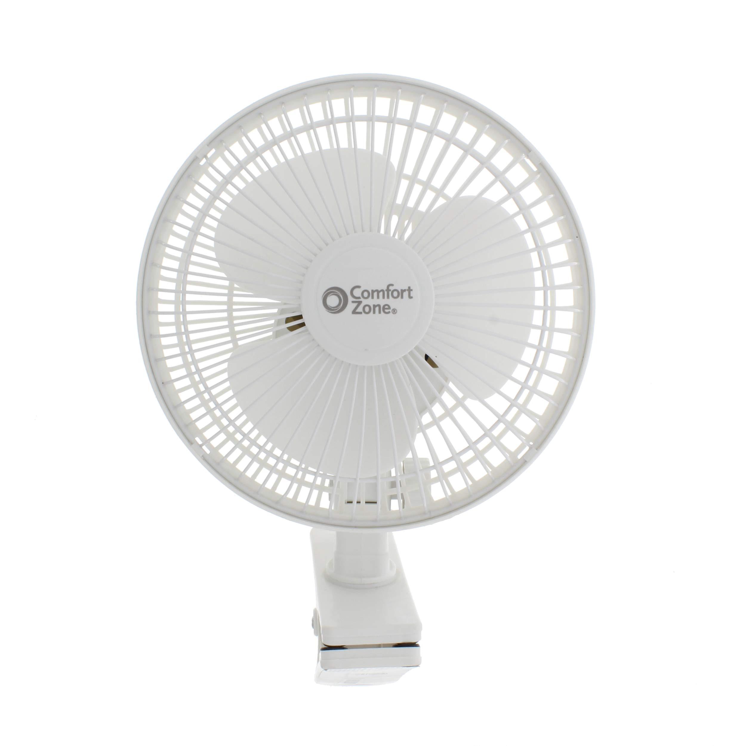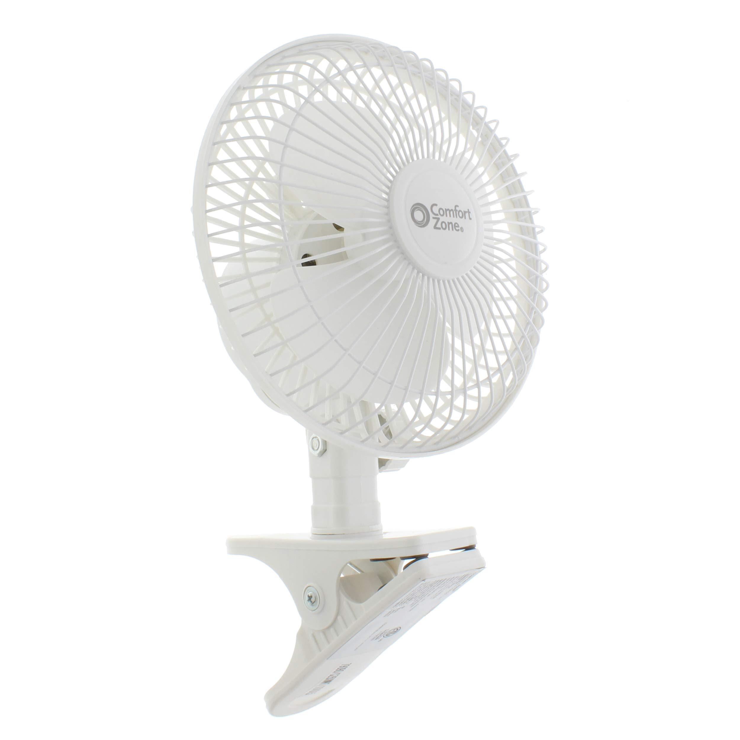 Comfort Zone CZ6C - 6" Clip-On Fan. Perfect for recessed use in home or office or on a table, desk or RV. Adjustable tilt to aim airflow exactly where you need it. Easily clips on to any surface with a strong clamp for firm grip. Whisper quiet, reliable operation. Two speed rotary control adjusts speed to customize air flow: high or low. Built in carry handle. Tough break-resistant ABS plastic blades. Poly-coated metal safety grill prevents any user injuries and damages to the fan itself. Wind Speed feet per second. Measures: " long x " wide x " high. ETL listed. Color: White. Did you know that electric fans can do more than just cool? They circulate the air, keeping it in motion, maintaining a fresh breeze that cools as well as reduce humidity levels. Fans also add ventilation and prevent the inhalation of dangerous gases and fumes. As a top brand in the Americas, Comfort Zone is featured by some of the largest and most recognized retailers worldwide. All Comfort Zone products are designed and tested to exceed UL, ETL, SAA, CE, NOM and other global marks for quality. They are manufactured under the supervision of our U.S. and China based Engineering and Technical Staff. HBC Home & Hardware Products - driven to perfection producing quality products for everyday living.