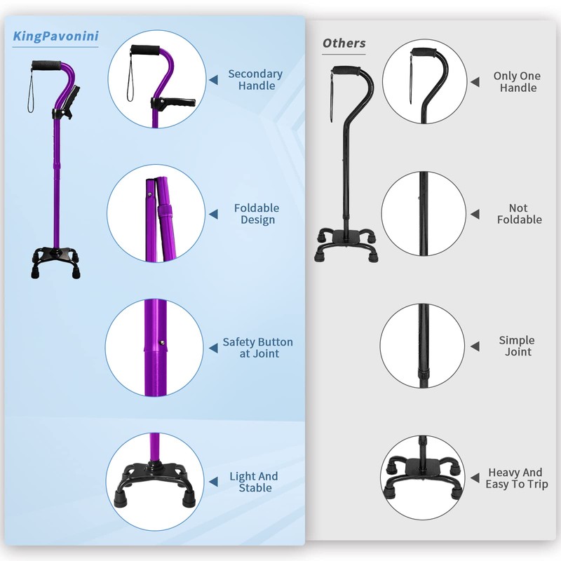 - [OPTIMIZED 4-PRONGED QUAD BASE] -The size of the 4-pronged base of the walking cane has been carefully optimized for elderly and postoperative people, much more stable.The 4-pronged base is a little smaller than similar products on the market so as to avoid tripping themselves during use. It is convenient to place it stably at any time any where without hand holding.
