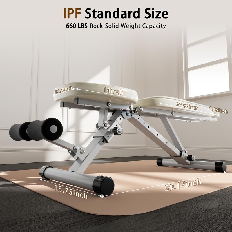- 【Multi-Functional Design】 One Bench Unlocks All Training Scenarios. IPF-certified bench co-designed by powerlifters delivers pro-grade precision. Its ‘Transformer’ versatility shines with 9 backrest/4 seat/3 leg roller settings, enabling bench presses, flyes, split squats, and more – all major muscles covered. Silent cylindrical legs permit night workouts without noise. Your all-in-one gym partner for athletes and beginners alike.