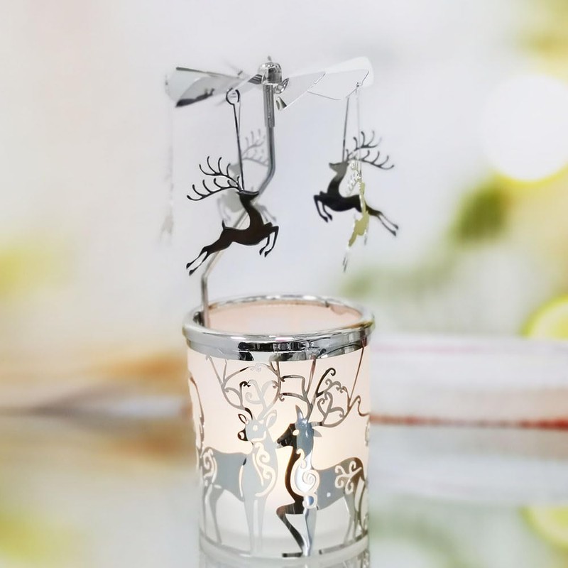 adkinzim Rotary Candle Holder Spinning Tea Light Candleholder Carousel Candlestick Holder for Mothers and Children Festival Gift (Silver Reindeer)