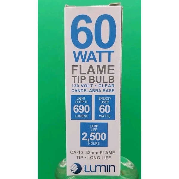 ADL LUMIN LUMIN L1306 60 Watt Clear Candelabra Base Long Life Flame Tip Bulb Brand New!