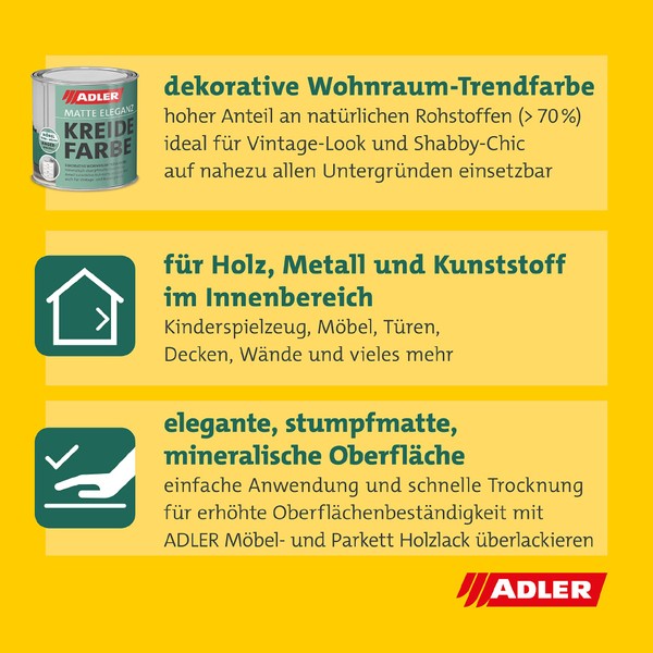 ADLER Chalk paint is a high-quality, environmentally friendly and sustainable paint that achieves perfect coverage and an ultra-matte finish. It is odourless, block-resistant, easy to work with and is suitable for the decorative design of furniture and living rooms. The versatile and robust paint is universally applicable and suitable for almost any surface. Whether wood, metal or plastic? Everything can be painted with it. In addition, chalk paint results in a matte but beautiful finish. Even if you work with dark colours, the end result will still remain matte. All the advantages at a glance: chalk paint for wood, metal and plastic. Stump mat, mineral surface. High proportion of natural raw materials (over 70%). Easy to use and quick drying. For increased surface resistance with furniture parquet wood varnish over paintable retro chic made easy with chalk paints. Give your old furniture, doors, ceilings and walls a dull matte vintage look. You only need the paint to paint and no additional primer, a protective varnish or other products. If you want to try the trendy shabby chic look, you can also use the DIY colour. Green label. The award for particularly sustainable ADLER products. The water-based, matte chalk paint for indoor use is characterised by the high proportion of natural raw materials of over 70%. It is chemical free and contains no harmful substances.