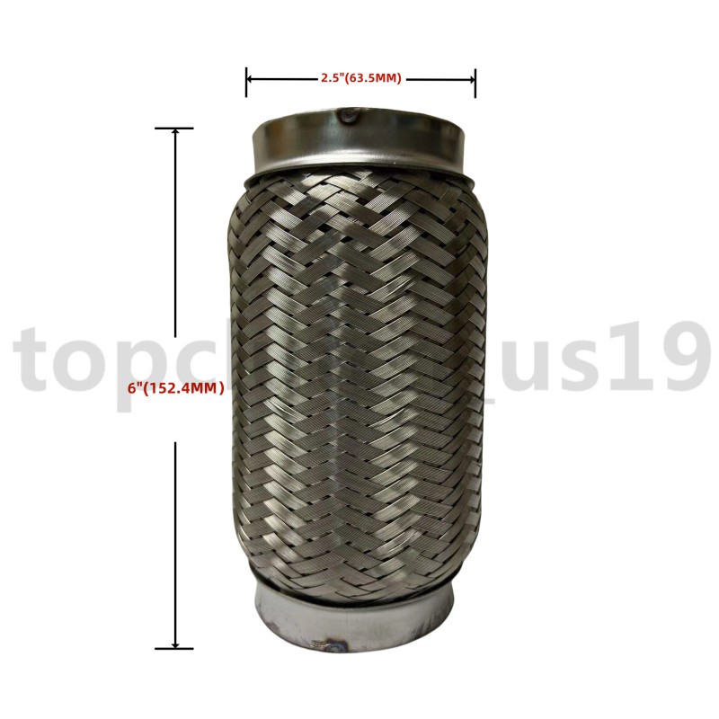 Specification This series of professional quality flexible exhaust connector pipes is intended for weld-in installation in an exhaust system to isolate noise, relieve vibration, and reduce the stress on the pipes a stainless steel internal bellows for vibration isolation, internal stainless steel braid to reduce noise and/or whistling, and an externalstainless steel braid for protection of the bellows. These are sized to fit over the tubing and be welded in place with the weld penetrating into the inner sleeve. Features ID: 2.5" (63.5MM) Length: 6" (152.4MM) Material: Stainless steel Construction: Bellows+Inner braid+Out braid Package: Comes with 1PCS Pipe as the pictures shown Professional installation is highly recommended. |
