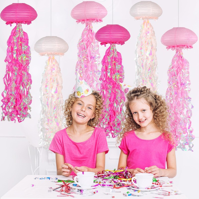 - 💗Jellyfish paper lanterns: This jellyfish paper lantern consists of 6 paper lanterns, including 2 dark pink jellyfish paper lanterns, 2 light pink jellyfish paper lanterns and 2 pink jellyfish paper lanterns. The multi-color jellyfish paper lantern decoration set must be the best choice for a fun underwater party, the rich colors will create a dreamy and colorful ocean world