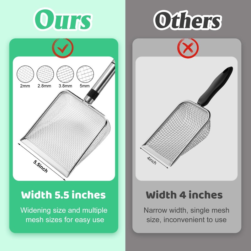 - Convenient size:Garden soil sifter is 11.4 inches in overall length and the handle is 5.5 inches long for easy holding. The mesh screen is 5.5 inches wide, which is wider than other sifting shovels and is perfect for sifting sand, dirt and compost.