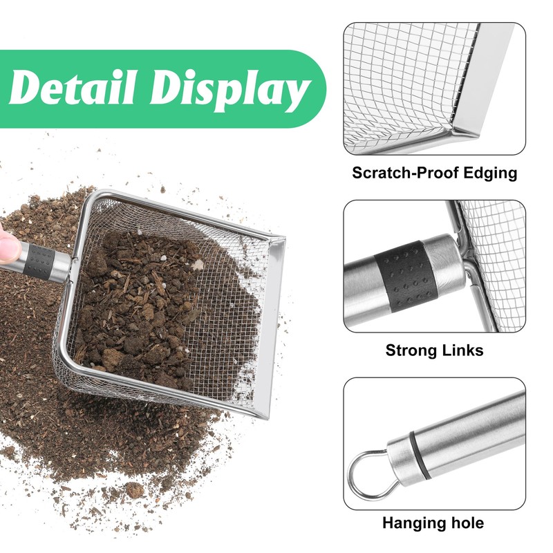 - Utility design:Garden mesh sieve shovel has a hanging loop for easy storage after your use. The handle is ergonomically designed to be easier to use than traditional round sifters, ensuring a more comfortable experience for you.