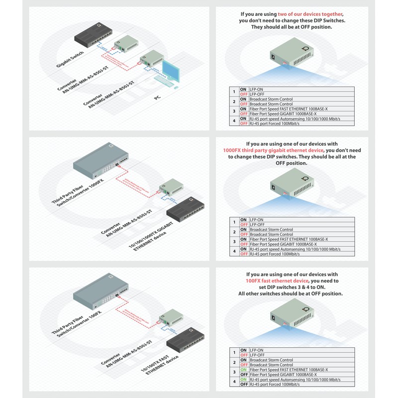 - Supports Dual Speed Fiber Mode (configurable by dip switch) C Select 1000Base-SX or 100Base-SX C interconnecting with existing fiber nodes is easy with this media converter. Wavelength C 850nm, Use it with Multimode Fiber Only.