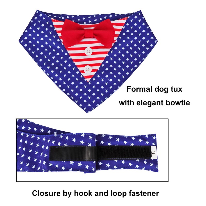 - American Flag Dog Tuxedo Bandana: Designed with formal dog tux style, elegant bowtie, red stripe and blue star pattern, full of independence day atmosphere, Wearing this formal dog bandana, let your dog looks like a gentleman during holiday.