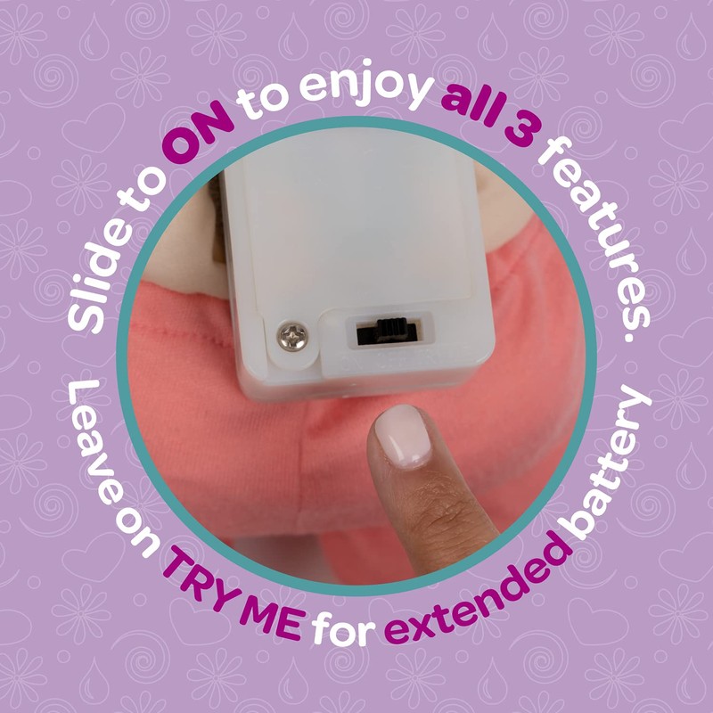• 3 Touch-Activated Features: GIGGLES when tickled in the belly; CRIES when squeezed in the right hand; and SUCKLES when fed with the bottle; medium skin tone and brown eyes