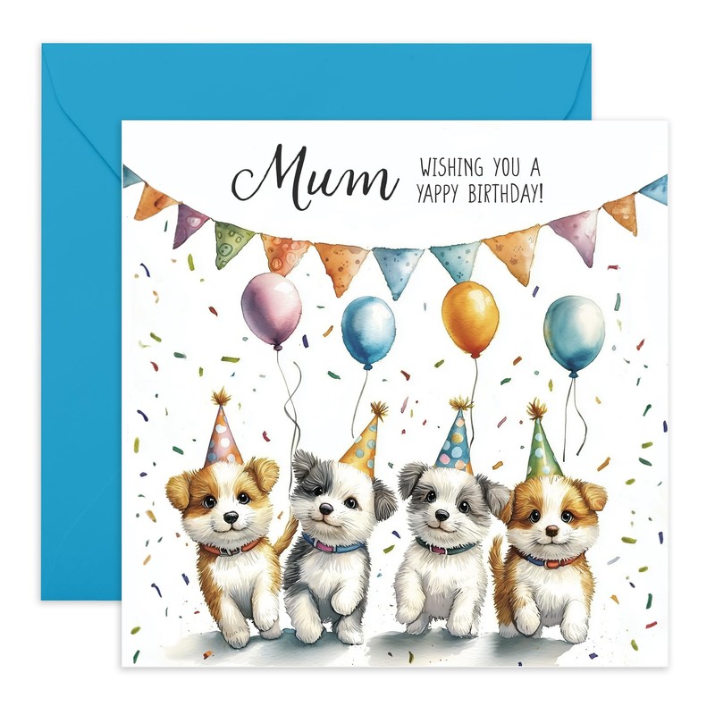 Adorable Pets Birthday Card - 'Puppy Yappy Birthday Mum' - Gifts for Mother, Wife, Ma, Parent, Women, Her - Puppies & Hats - Comes with Fun Stickers