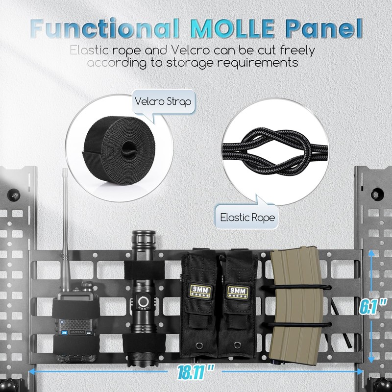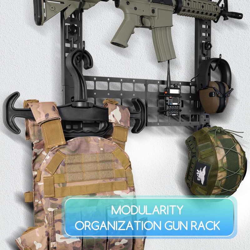 - ENJOY MODULARITY ORGANIZATION GUN RACK - 6pcs J-hooks, Molle-hole panel, and an extra organizer that came with the kit give a lot of options for your setup so it will mostly depend on how many long guns you will hang up. You can, in a matter of moments, reorient the attachments so that they can fit practically any of your needs.