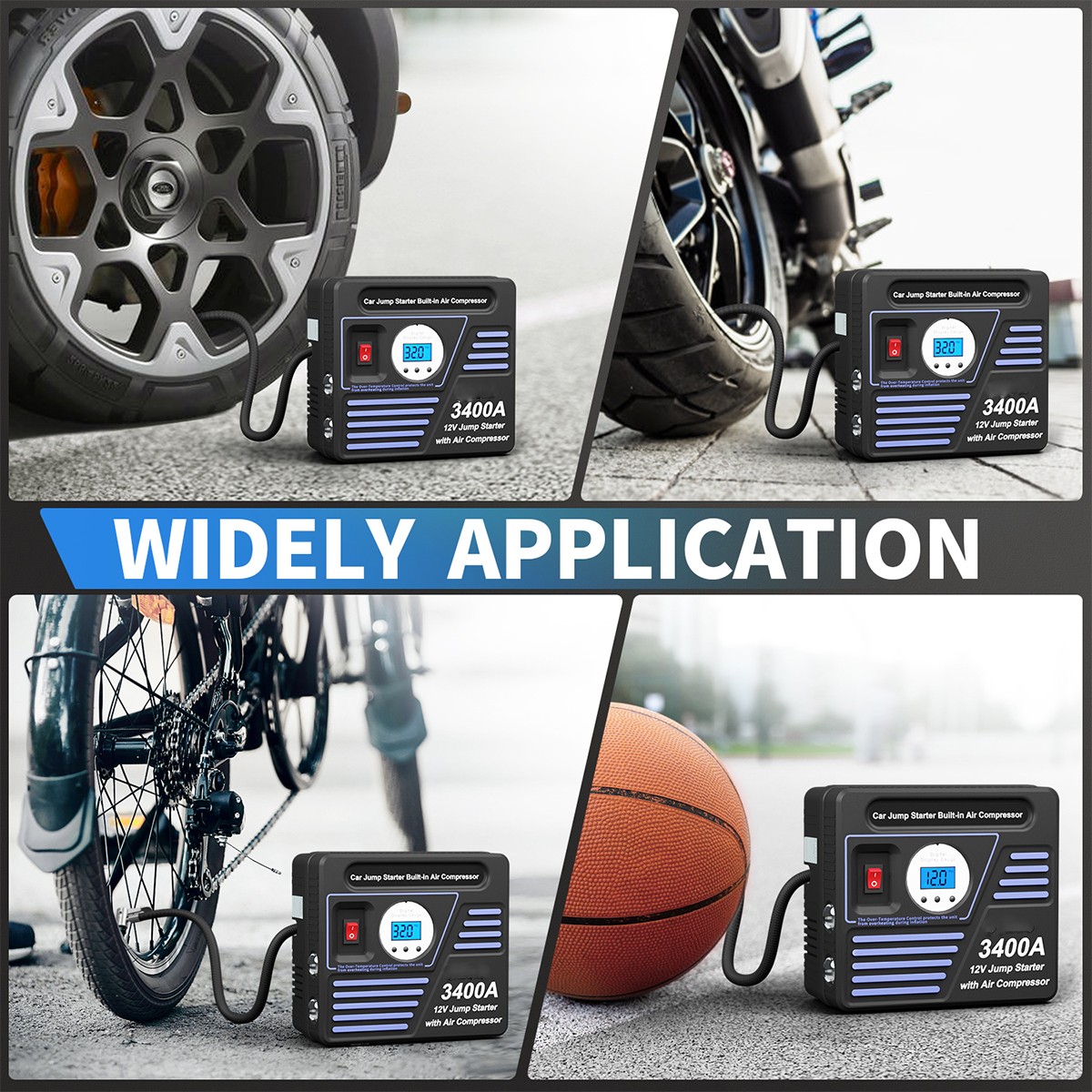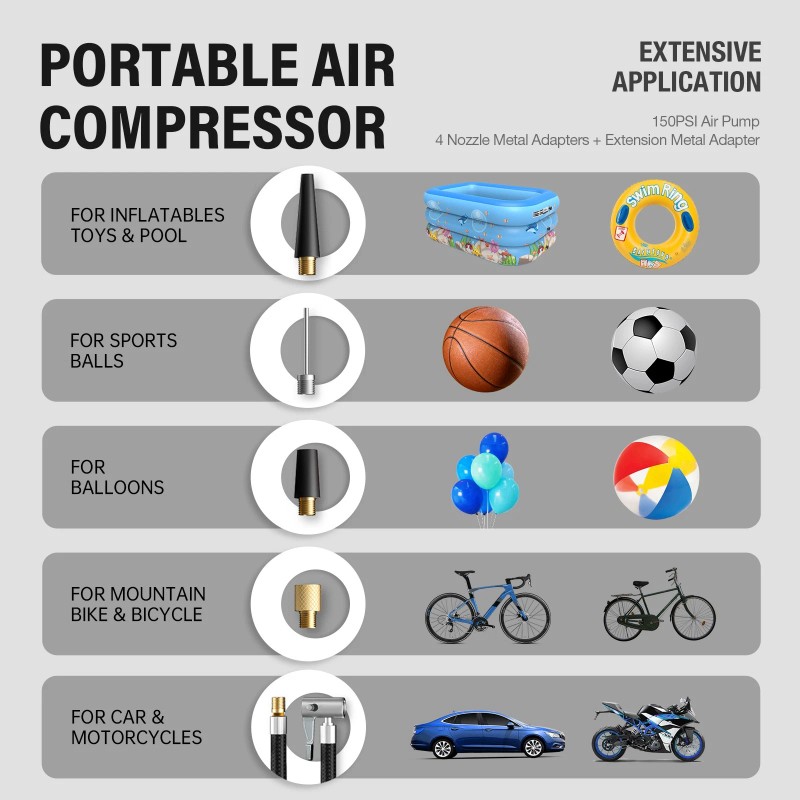 The multifunctional air compressor. Extension air hose with 4 air inflation adapter can inflate car tires, bike, air bed, sport balls. air swimming pool, and more inflatable products. Must have it in your life!