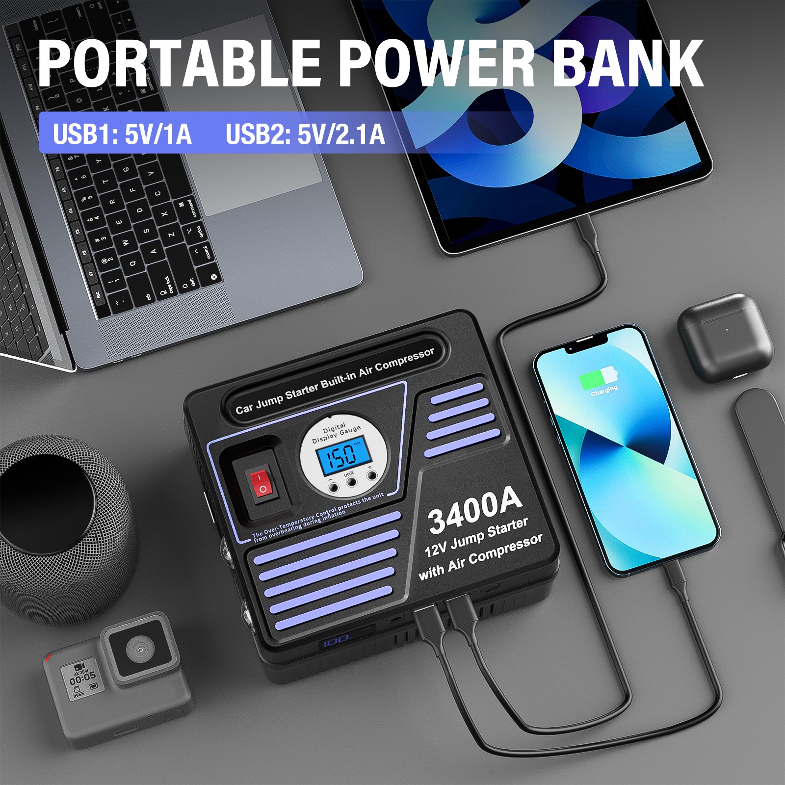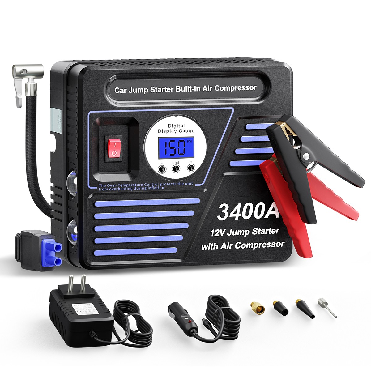 • 【Reliable Warranty and Life-time Service Support 3400A Portable Lithium Car Battery Jump Starter Packing & Air Compressor with 30W quick charger, heavy-duty smart jumper cable clamps, 12V DC car charger, extension air hose, portable storage bag, ball needles, tapered nozzle, short nozzle, metal adaptor, user manual. 1-Year warranty, and designed in the USA.