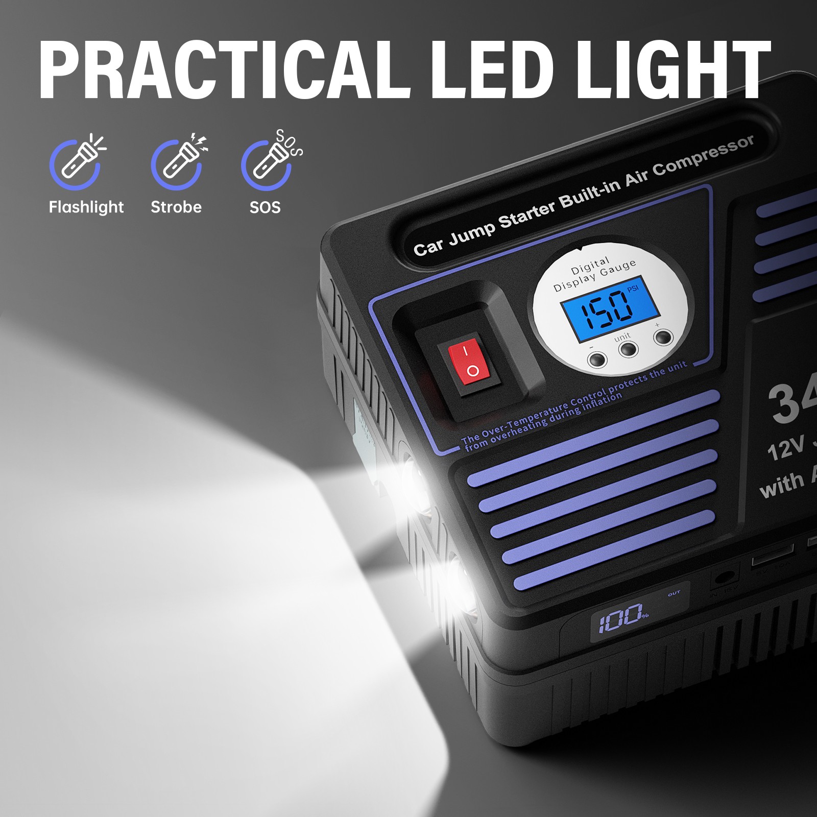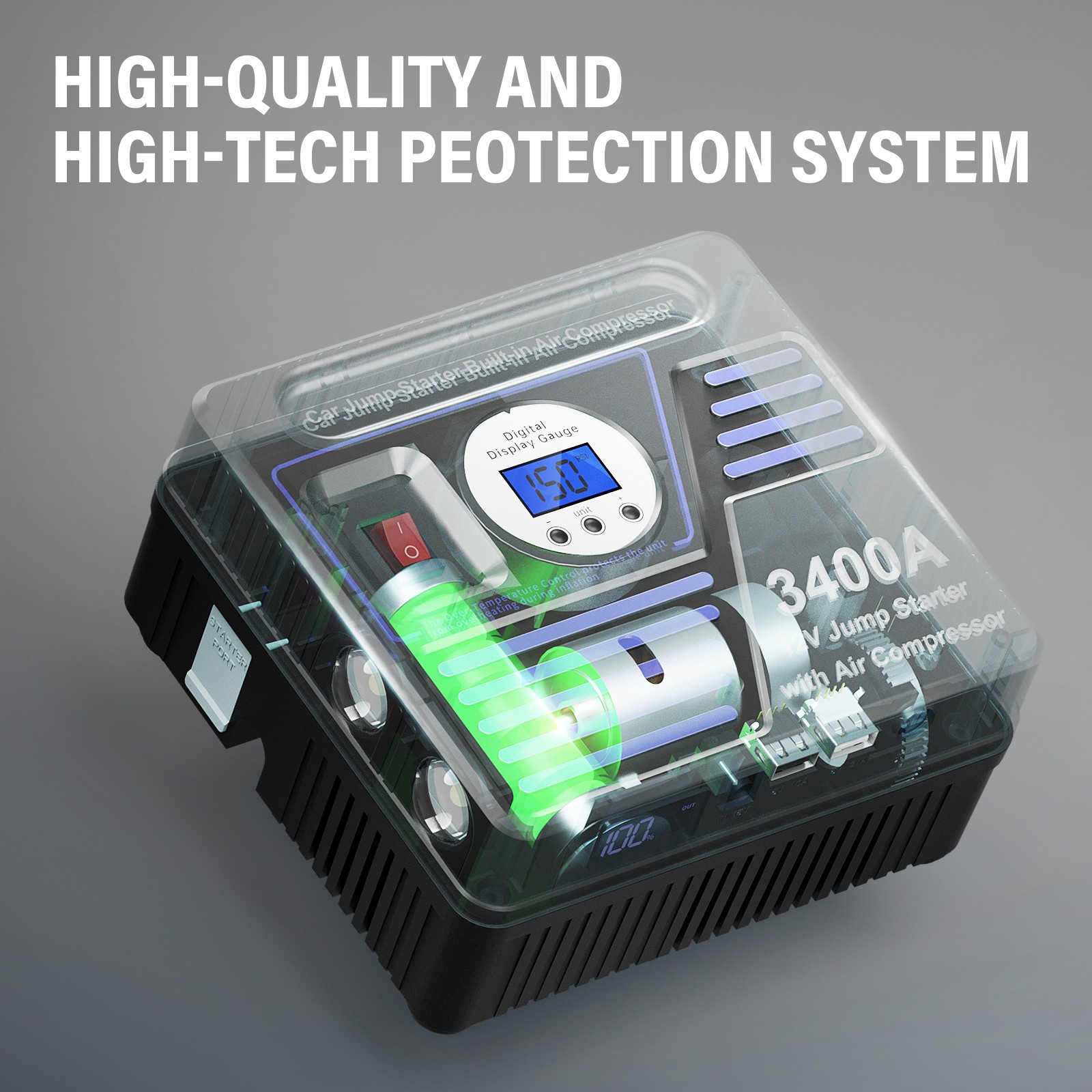 • 【Built-in 150 psi Air Compressor / Tire Inflator】The powerful digital air compressor can provide maximum pressure of 150 psi and airflow of 35 L/Min, supports tire-pressure detection, preset values stopping and 4 unit switching (bar, psi, kPa, kg/cm2). Pumping up a standard tire in 4 minutes only. Can last 45 minutes, but please stop in every 10 minutes to cool down the air pump.