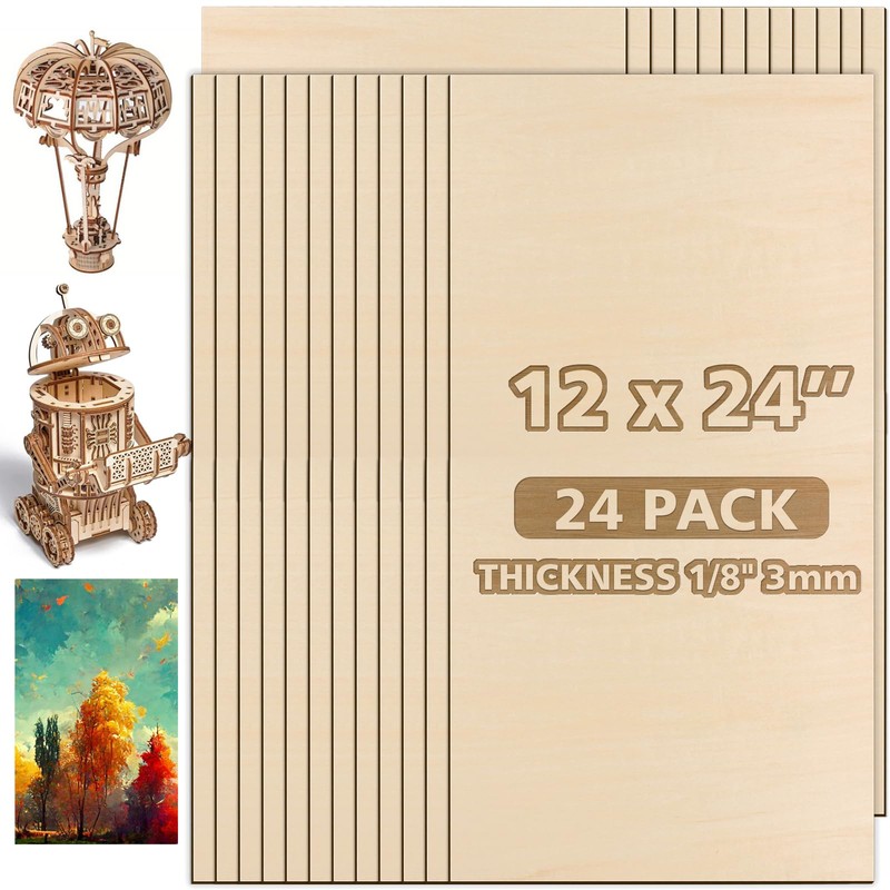 Adrattnay 24Ps Basswood Sheets 12 x 24 x 1/8' - 3mm Plywood Sheets for Laser Cutting and Engraving, 1/8in Large Basswood Unfinished Laser Wood for Model Crafts and DIY Ornaments