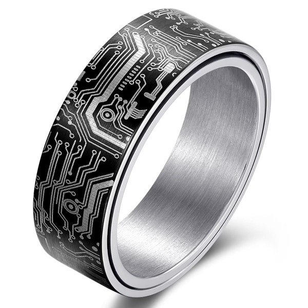 Adreamz 8mm Black Silver Spinner Computer Circuit Board Ring For Men Anxiety Fidget Relieving Black Stainless Steel Ring Pipe Cut Edge Programmer Wedding Ring 7