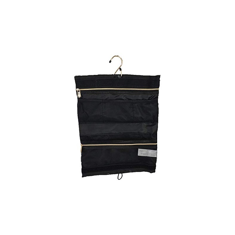- Hanging travel cosmetic case in nylon. Unfolds to interior with 2 zip pockets 3 mesh slip pockets and hanger hook. Folds with interior velcro closrue and exterior loop and button closure. 10.5" W x 6.5" H - 13"H opened Imported