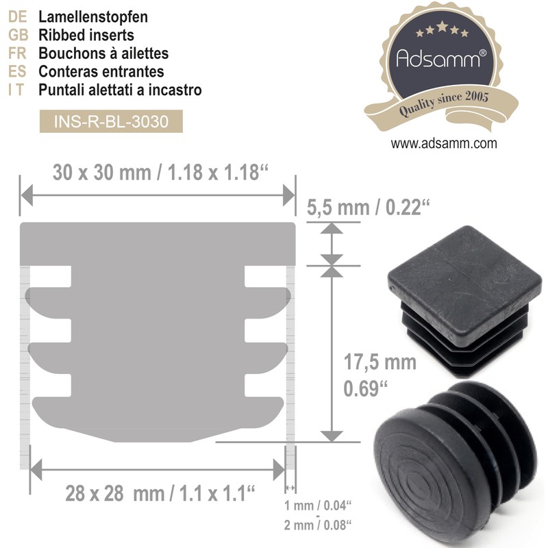 - Outer diameter: 30 x 30 mm / suitable for square square tubes with an inner diameter of 26 x 26 - 28 x 28 mm / wall thickness: 1 - 2 mm / black / square / the ribbed lamellar plugs make it easy to move round tube furniture and provide a practical and safe protection of furniture and floors from scratches, scrapes, bumps and dirt.