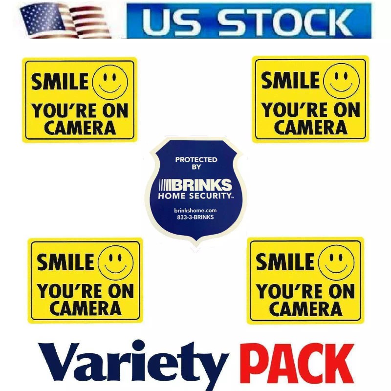 BRINKS HOME SECURITY WINDOW WARNING STICKER+SMILE VIDEO CAMERA DECALS . Includes 1 NEW WATERPROOF BRINKS HOME SECURITY STICKER + 4 SMILE SECURITY CAMERAS IN USE STICKERS! WATERPROOF and U/V PROTECTED! BRINKS stickers measure 3-3/8 " W x 3-3/4" H. Camera warning stickers measure 4 " wide x 3" tall and are SURE TO GET NOTICED with their bright color and friendly warning about security cameras. These are GREAT for preventing theft , loitering , robbery , employee misconduct , trespassing and more! These will DRAW ATTENTION and ALERT PEOPLE that they are being taped. Even if you dont have any cameras people will think you do!