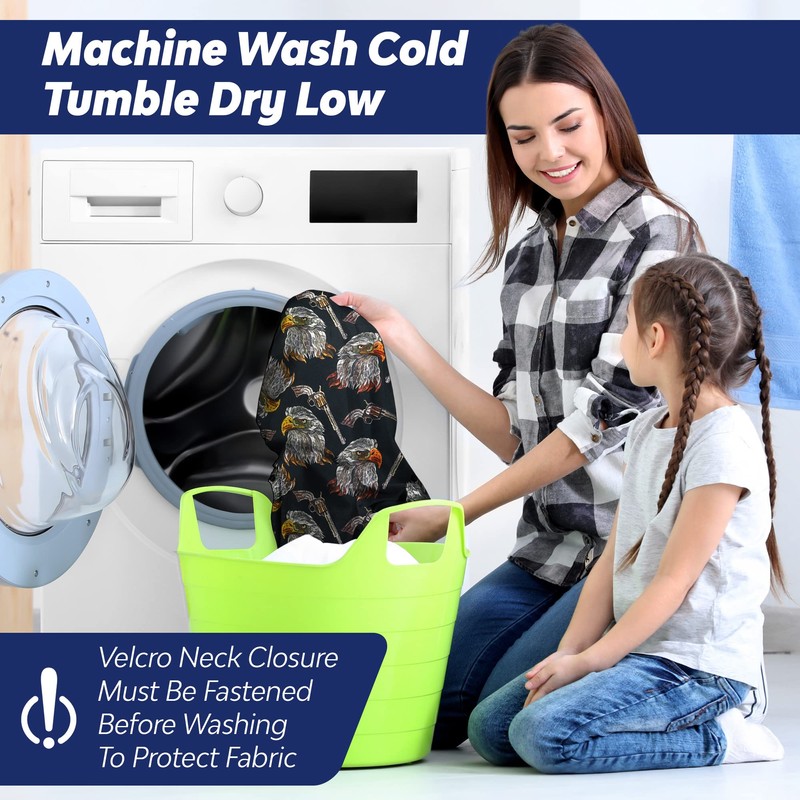 - Machine Washable: Stains wash easily from the polyester fabric. Close the hook & loop neck fastener when washing to prevent damage to the fabric. Wash with cold water and with similar colors.
