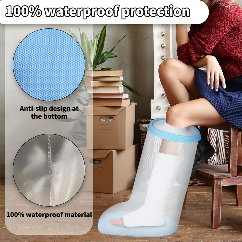 - KT6103 Waterproof leg cast cover for shower.New Non-slip bottom design. We add a non-slip at the bottom to increase extra friction in the shower to avoid slipping. The opening hole fits lower leg circumference from 13.7" to 17.7"inch(35 to 45 cm). Fully submersible deign can keep your bandage and wound dry when take shower.