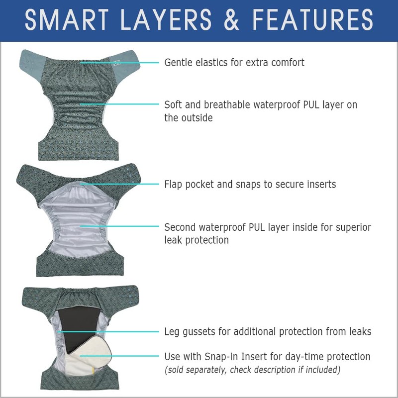 Our premium cloth diaper cover promises a noise-free, snug fit for most body types, addressing light to heavy incontinence, including urinary urge, overactive bladder, bowel incontinence, bedwetting, and more. It reduces rashes, maximizes comfort, and minimizes leaks with innovative materials.
