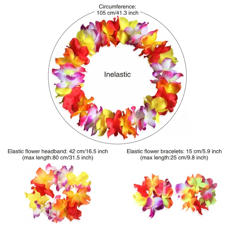 - Necklace circumference:approximate 41.3 inch/(105 cm);Elastic flower headband: 16.5 inch/42 cm(max 80 cm);Elastic flower bracelets: 5.9 inch/15cm (max 25 cm)