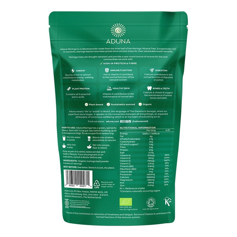 - VEGAN & CERTIFIED ORGANIC: 100% pure moringa leaf powder and certified by Soil Association. All Aduna products are natural with no added sugar, preservatives, additives, gluten, wheat or dairy ingredients