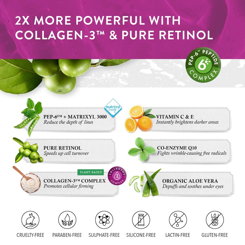 - 3X deeper-reaching with Pep-6 & Collagen-3: Our patented PEP-6 complex contains cell-signalling peptides that reverse the ageing process. Products with regular collagen are ineffective as the molecules are too big to penetrate the skin. Collagen-3 contains high, low & fragmented collagen for 5X the efficacy.