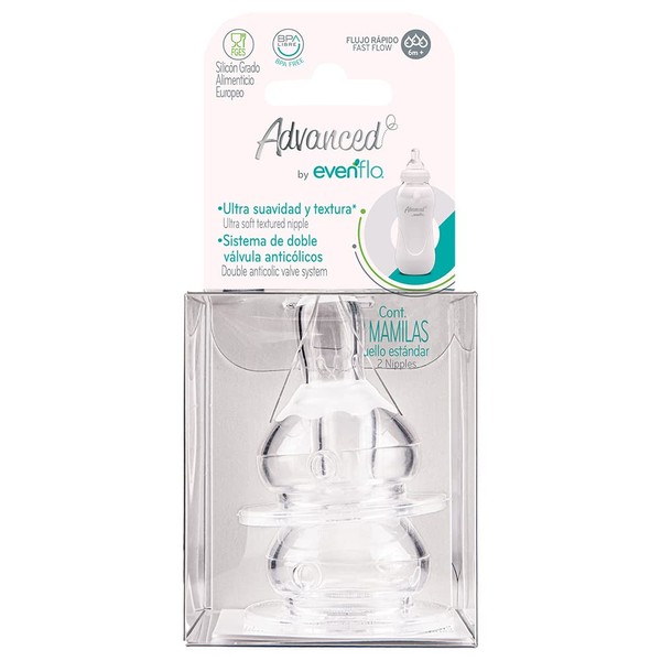 - Mamila Advanced by Evenflo cuello estándar elaboradas con silicón grado alimenticio Europeo libre de BPA.