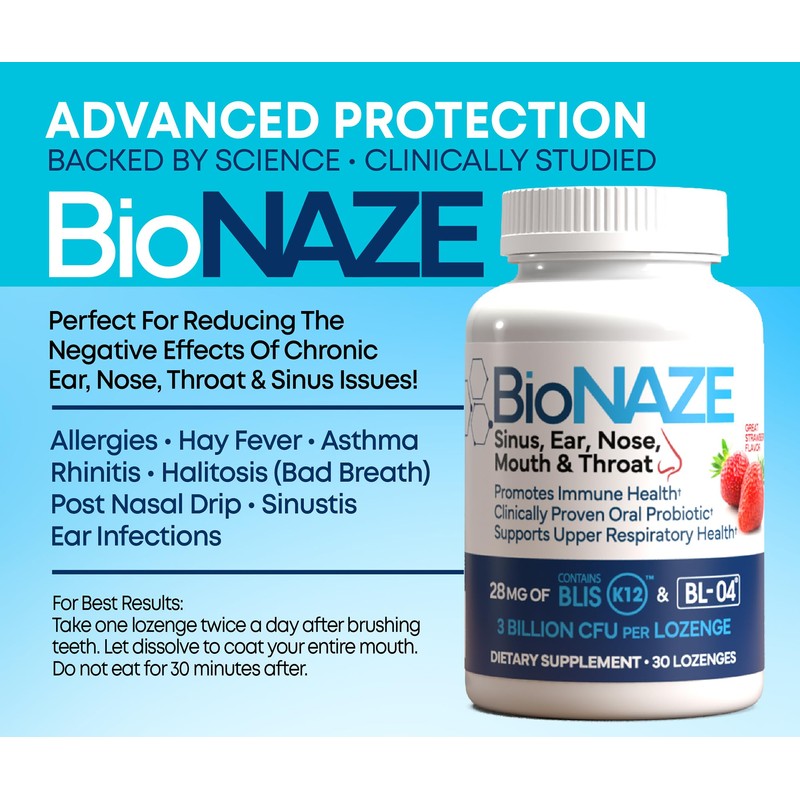 Bionaze Oral Probiotic BLIS K12 & BL-04 for Sinus, Tonsil Stones, Bad Breath, Post Nasal Drip, Throat, Mouth, Teeth & Gut - Improve Oral & Respiratory Health. Clinically Proven Probiotic Strains 30 ct
