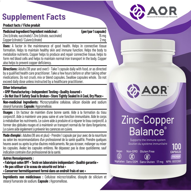 Advanced Orthomolecular Research AOR - Zinc-Copper Balance - Zinc 15mg & Copper 2mg, 100 Capsules - A Balanced Ratio of Two Key Minerals for General Wellness - Zinc Citrate and Copper Supplements - Ideal for Men