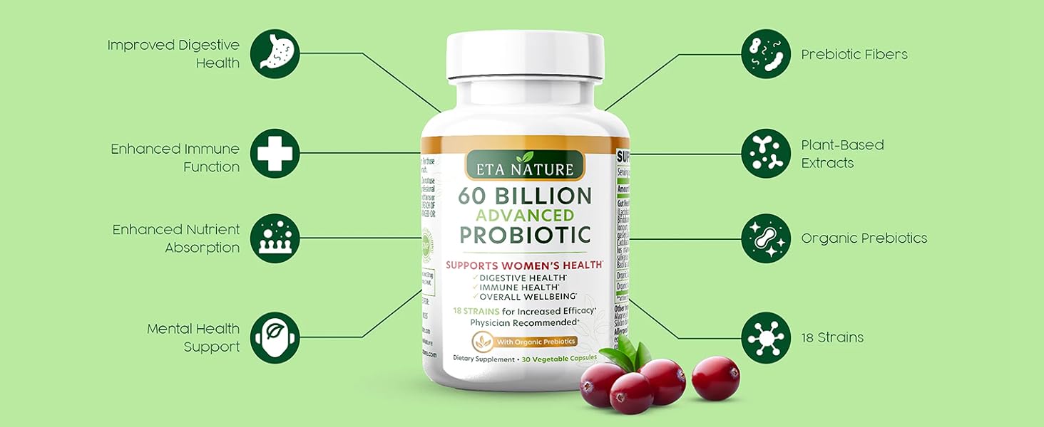 Advanced Probiotics for Women with 60 Billion CFUs 18 Strains Lactobacillus & Cranberries - Prebiotics and Probiotics for Womens Digestive Health Gut Support & Vaginal Health, Yeast & Flora