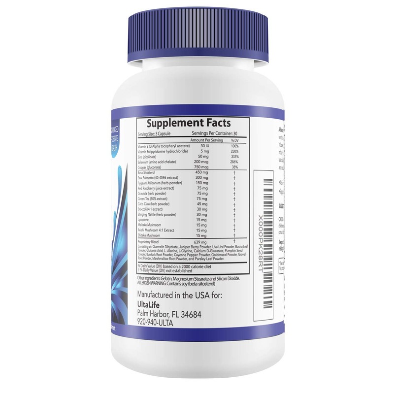 Feel like a younger man again. It's about keeping your prostate in a healthy, robust condition so that you CONTINUE to perform and enjoy your manhood at any age. If you want to keep the feeling of power, confidence, virility and independence you need to keep your prostate healthy and in good condition. Contains Saw palmetto and other powerful dht blockers that help prevent DHT production - Saw Palmetto is essential to blocking 5-alpha-reductase, an enzyme that converts testosterone to DHT. DHT is a molecule inside of your body that's responsible for hair loss, lowering the production of this hormone is key to preventing hair loss. Saw Palmetto has been used to help stop hair loss and support hair regrowth. MADE IN THE USA with the highest standards of quality and safety in NSF, GMP certified facility. UltaMan is your #1 BEST choice for a Prostate Complex that will give you satisfaction and super health results.