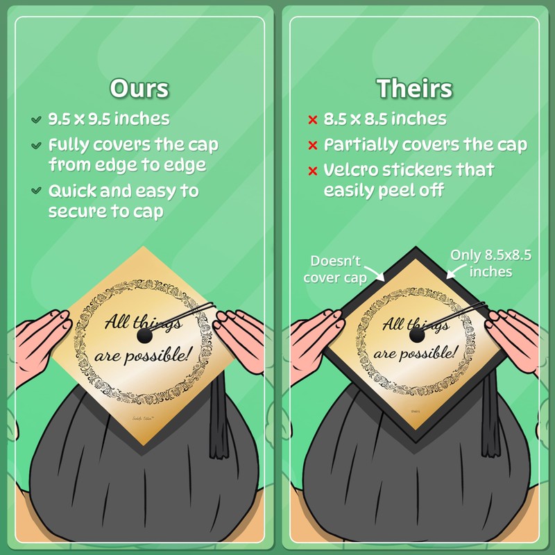 - PERFECTLY SIZED - Measures 9.5 inches by 9.5 inches. The design perfectly covers your graduation cap. Comes with a hole in the middle so you can easily move your tassel from one side to the other when your ceremony is over!