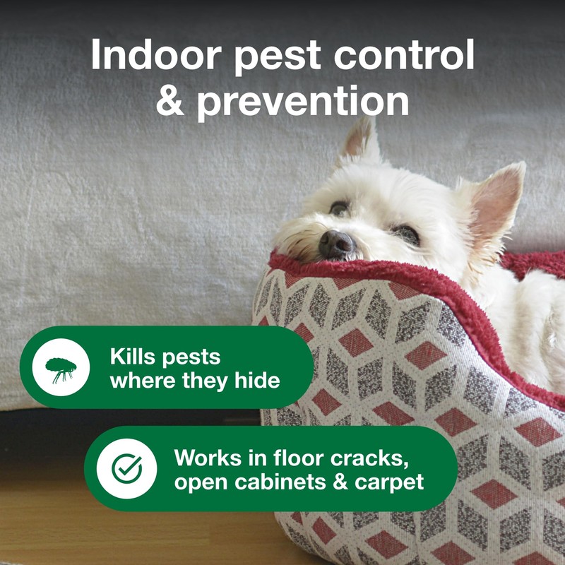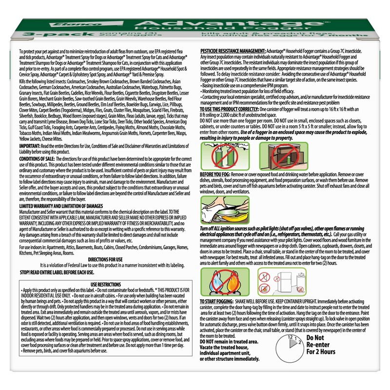 Advantage Household Fogger reaches fleas and other listed insects in places you can't see, such as hidden in carpets, rugs, drapes, upholstery, pet bedding, floor cracks and open cabinets