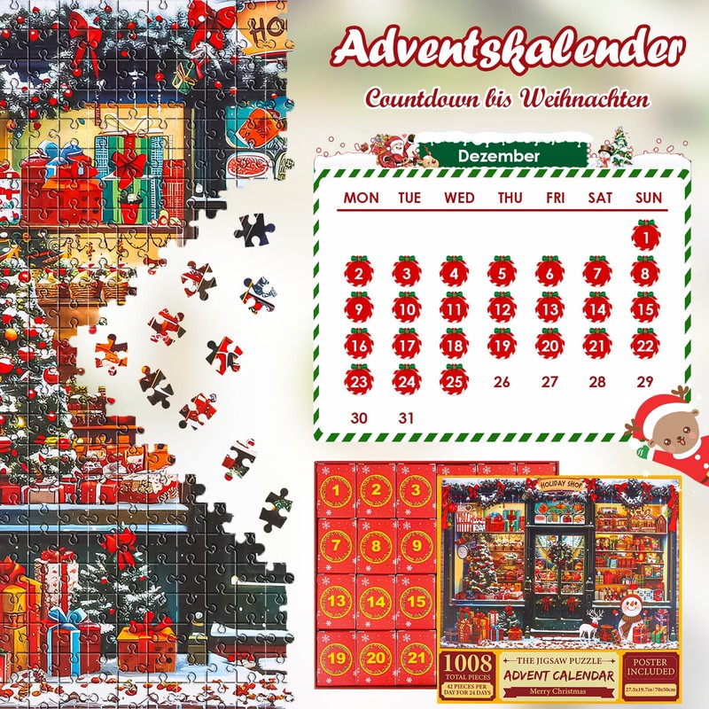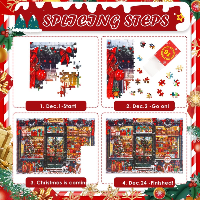- 🧑🎄【christmas advent calendar 】This Christmas puzzle advent calendar contains a festive gift box with 24 numbered boxes and a high-resolution Christmas poster. Fill in a box every day from 1 to 24 December and gradually reveal the complete 1008 piece puzzle by Christmas Eve, and enjoy a fulfilling countdown to Christmas.