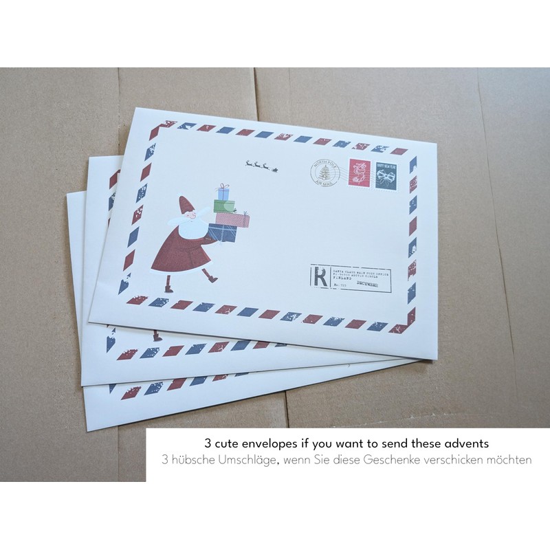 - Three folding cards size A5 (21 cm x 14.8 cm) with 24 doors plus three envelopes.