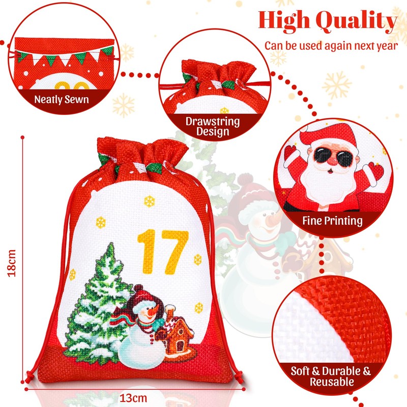 - 18 x 13 cm. Large size: our advent calendar bags for filling large offer enough space for large and small gifts such as biscuits (gingerbread man), sweets (candy cane), chocolate, nuts, ornaments (Santa Claus, elf), toys, scented candle, lipstick and greeting card. Meet your diverse DIY needs