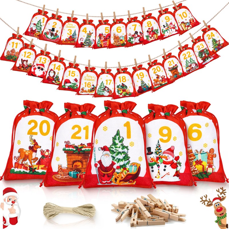 - Create a festive atmosphere: our Christmas calendars self-filling come with 24 wooden pegs and 1 roll of 10 metres of string. You can tie the string to Christmas tree, fireplace, stairs, window, wall or door, and then use the clips to easily attach the bag in place