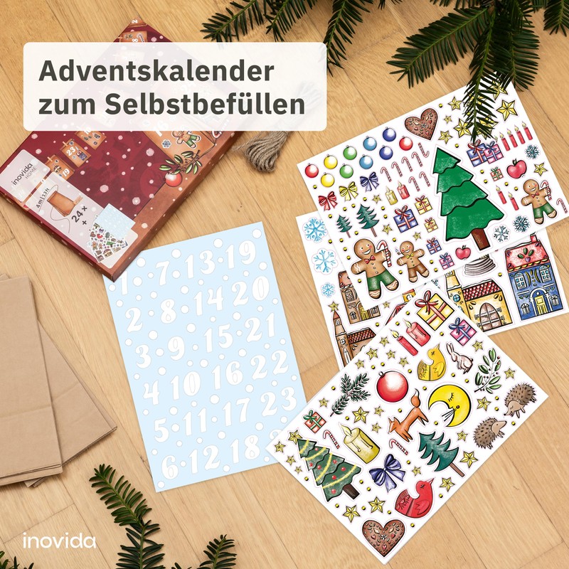 Advent calendar to make yourself by Inovida. A gift that comes from the heart. Create a very personal Do It Yourself advent calendar with colourful stickers and festive motifs - whether hanging or standing. Our DIY advent calendar set contains: 24 paper bags for filling, 24 wooden clips for closing the bags, Christmas sticker motifs, number stickers for numbering (1 – 24), 4 m jute string for hanging. It's that easy: If you want to give the calendar to a loved one, look for yourself. Beautiful small gifts together: For example, small Christmas decorations such as baubles or stars, delicious chocolate, buttons, cosmetics, candles, cookies or something homemade Fill the paper bags and close them with the wooden clips. With our jute ribbon you can hang the bags, but they can also be placed standing. If you want, you can also decorate your winter village with balls, pendants, a small fairy lights or branches. This creates a wonderful advent calendar in no time at all, which will beautify you and your loved ones the anticipation of the holidays daily with small surprises. Sustainably packaged with love: we pay attention to sustainable materials without plastic and use outer packaging made from FSC-certified paper. We wish you a contemplative Christmas season!