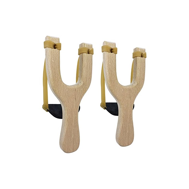 Two hand-carved slingshots made from solid beech wood for lasting durability. Perfect toy for teaching coordination and accuracy. Great for creating fun and competition for appropriate aged kids and adults. Disclaimer: Never aim a slingshot at another person, animal or at any fragile objects or materials.