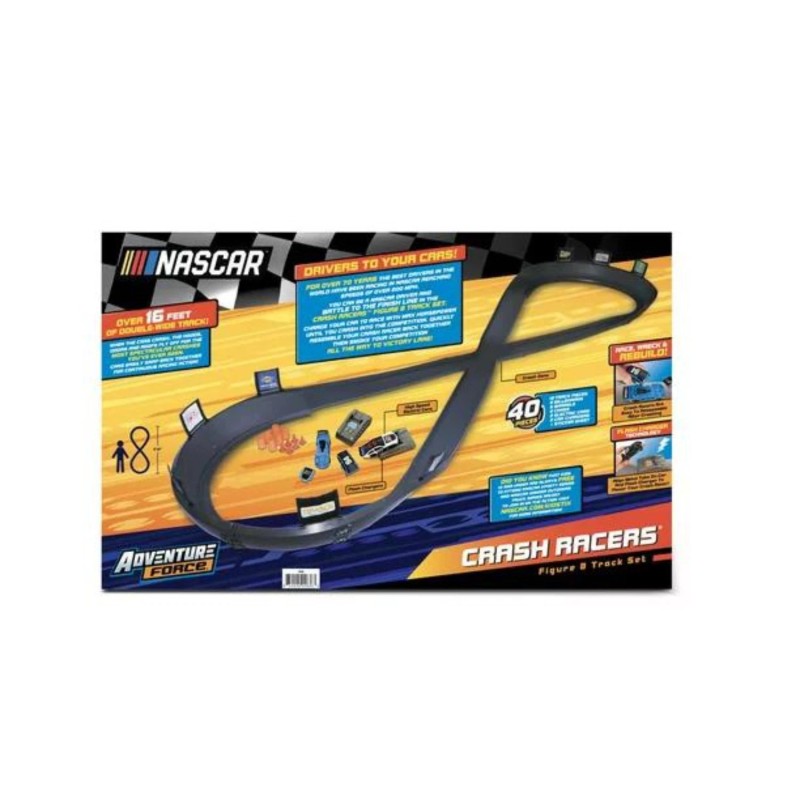 Race past the competition with NASCAR Adventure Force Crash Racers. Its the only track set where you can race, wreck and rebuild your cars on an officially branded NASCAR track. It combines motorized, high-speed racing with NASCAR vehicles that break apart on impact - the hood, doors and roof fly apart. Vehicles easily snap back together for continuous racing action. The set has over 16 linear feet of double-wide track in a figure 8 configuration (nearly 7 feet assembled), featuring the Crash Zone intersection. With official NASCAR branding and sponsored billboards, you can experience the excitement of a real NASCAR race. Start your engines by flash-charging vehicles in 10 seconds or less one charge provides enough power for up to 50 laps without needing to refuel. Even after a colossal collision, quickly reassemble your Crash Racer and battle to the finish to earn your spot-on Victory Lane. Only NASCAR Adventure Force Crash Racers lets you race like a pro.