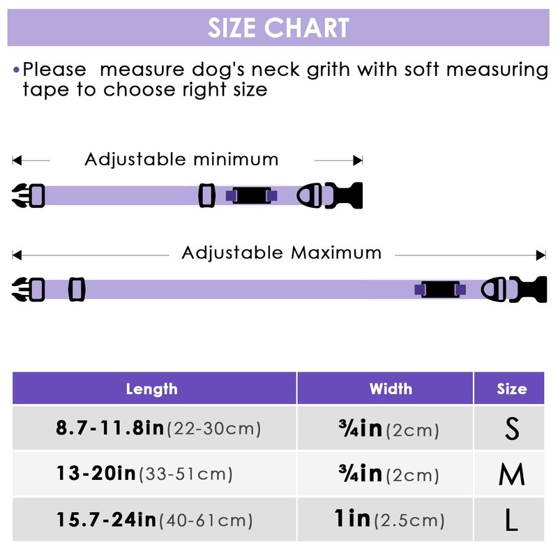 - Suitable for dogs of different sizes |Our adjustable-size dog collar suits dogs of various ages and sizes. Size S length fits neck circumference of 8.7-11.8 in, 0.75 in wide; Size M length fits neck circumference of 13-20 in, 0.75 in wide; Size L length fits neck circumference of 15.7-24 in, 1 in wide.
