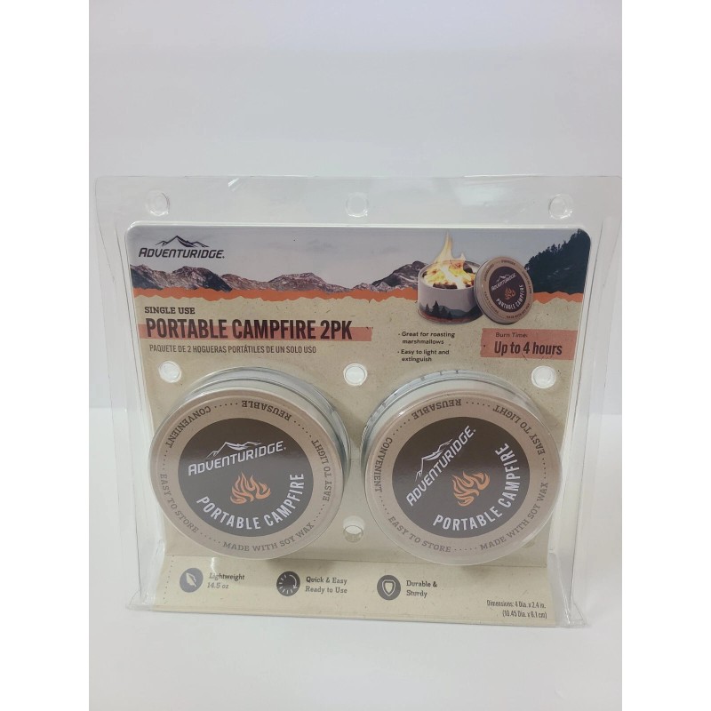 Adventuridge Portable Campfire 2 Pack Lightweight, Durable & Sturdy Up To 4Hrs. Adventuridge single use portable campfire 2pk up to 4 hours burn time. Great for roasting marshmallows, easy to light and extinguish.