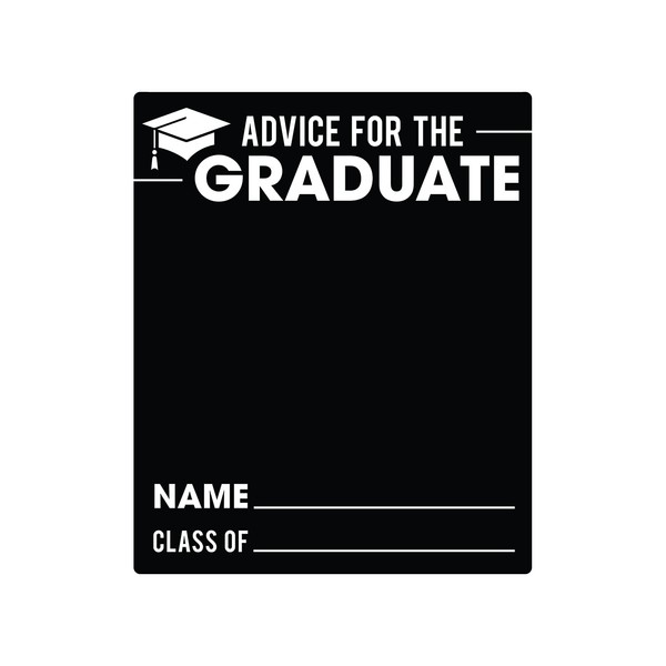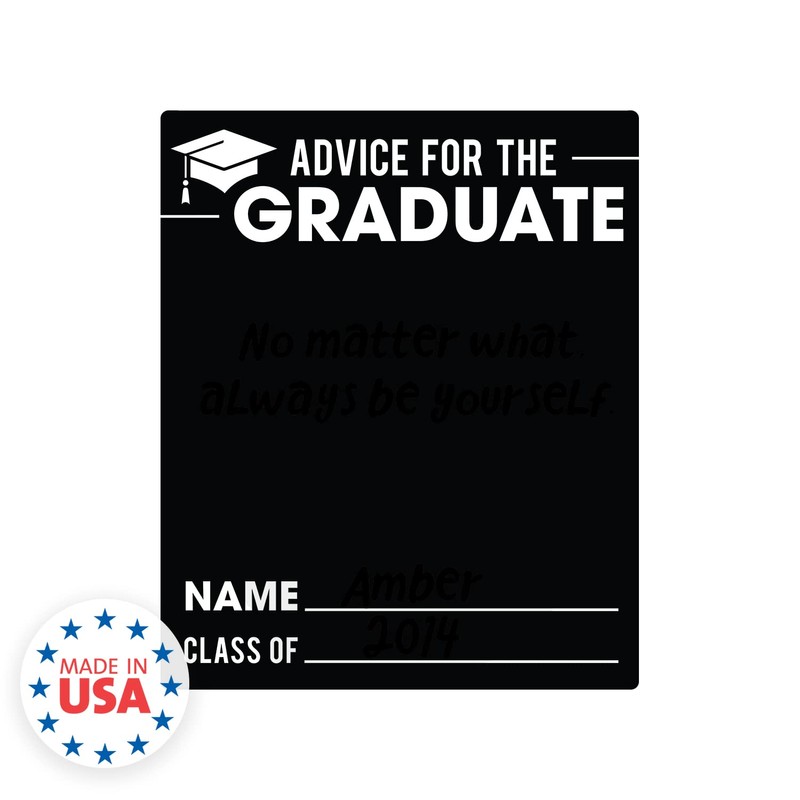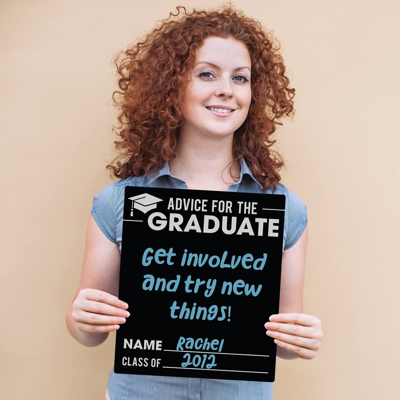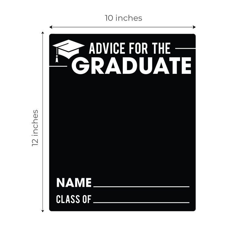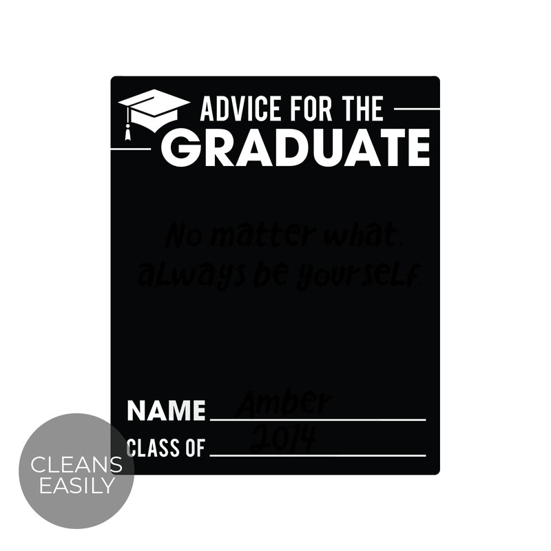 Graduation is a chance for a fresh start, new friends and life-changing experiences. Prepare your grad for long nights, study sessions and dorm life by writing your best advice on this photo booth style message board. Write a note; snap a photo and print lasting memories for your favorite graduate! This adorable photo prop sign works great for high school or college graduations. Features: