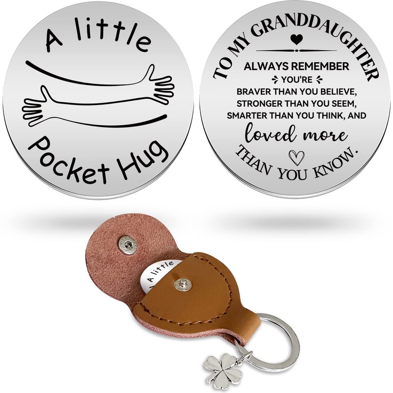 Advivio A Little Pocket Hug Engraved Stainless Steel Pocket Token Keepsake Double Sided Message Engraved and with PU Leather Keychain, Meaningful and Motivational Gift for Granddaughter